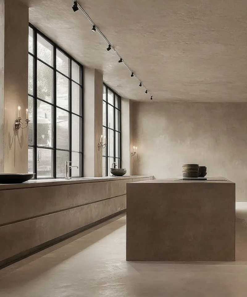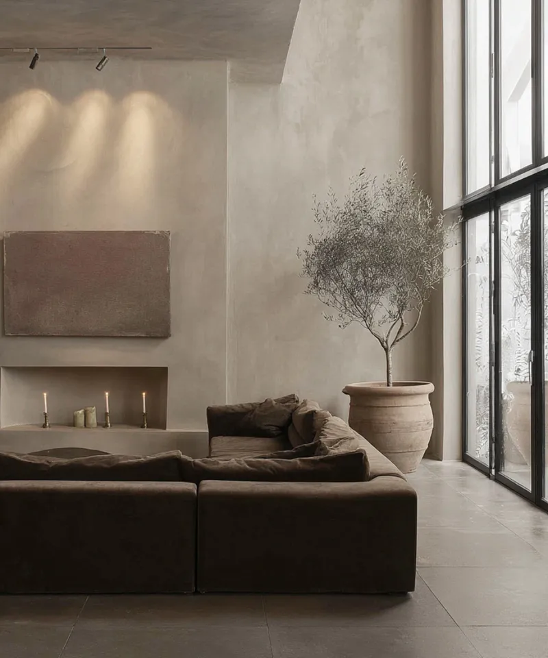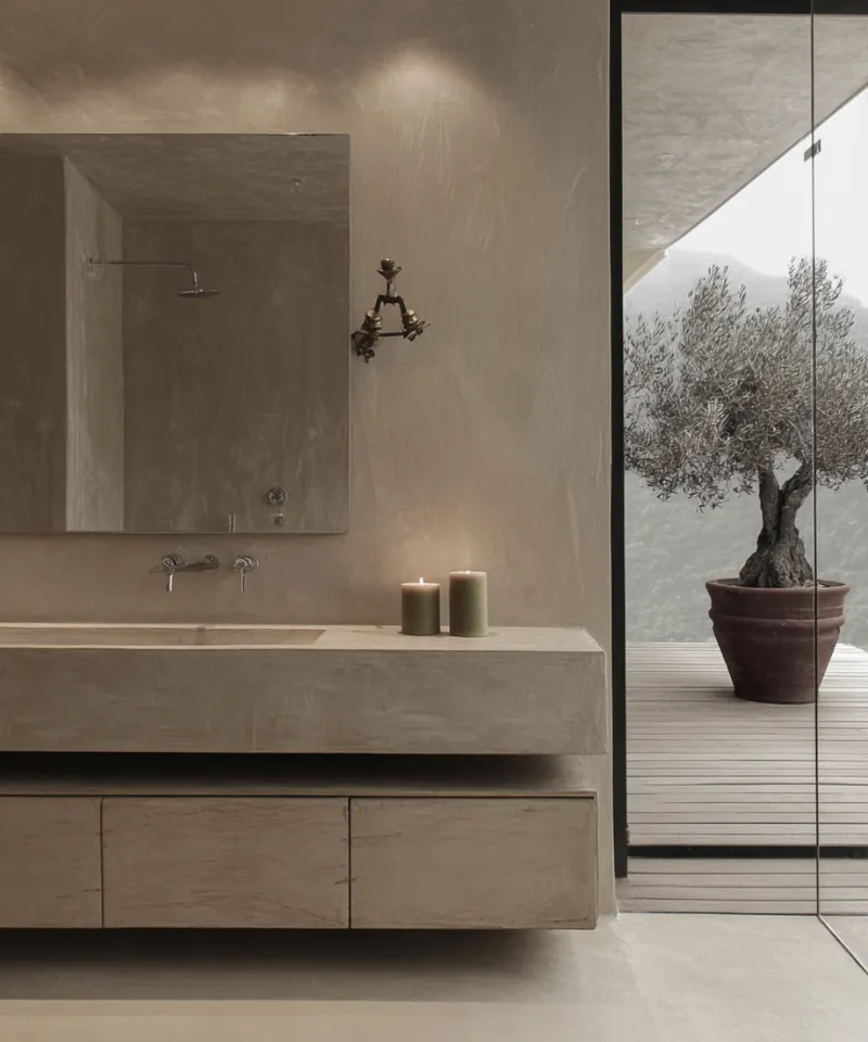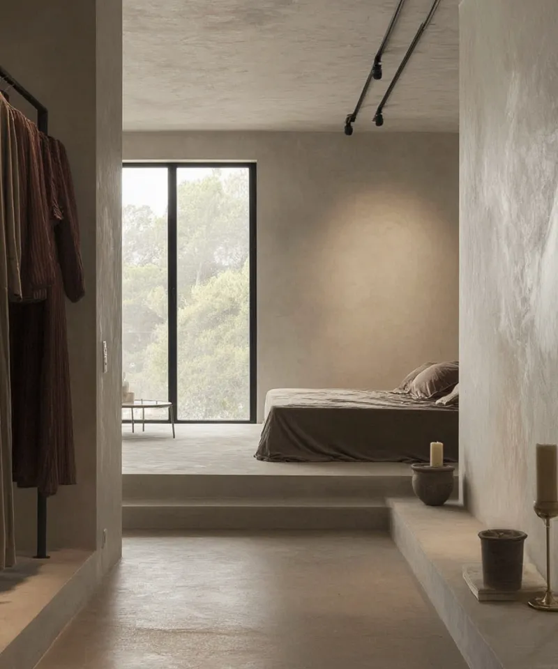 Ici, le minimalisme se réchauffe au contact de la matière et du temps. Les murs enduits, les sols en béton minéral et les volumes massifs dessinent une architecture minérale, brute et apaisée, où la lumière révèle des nuances de sable, de brun et de terre.