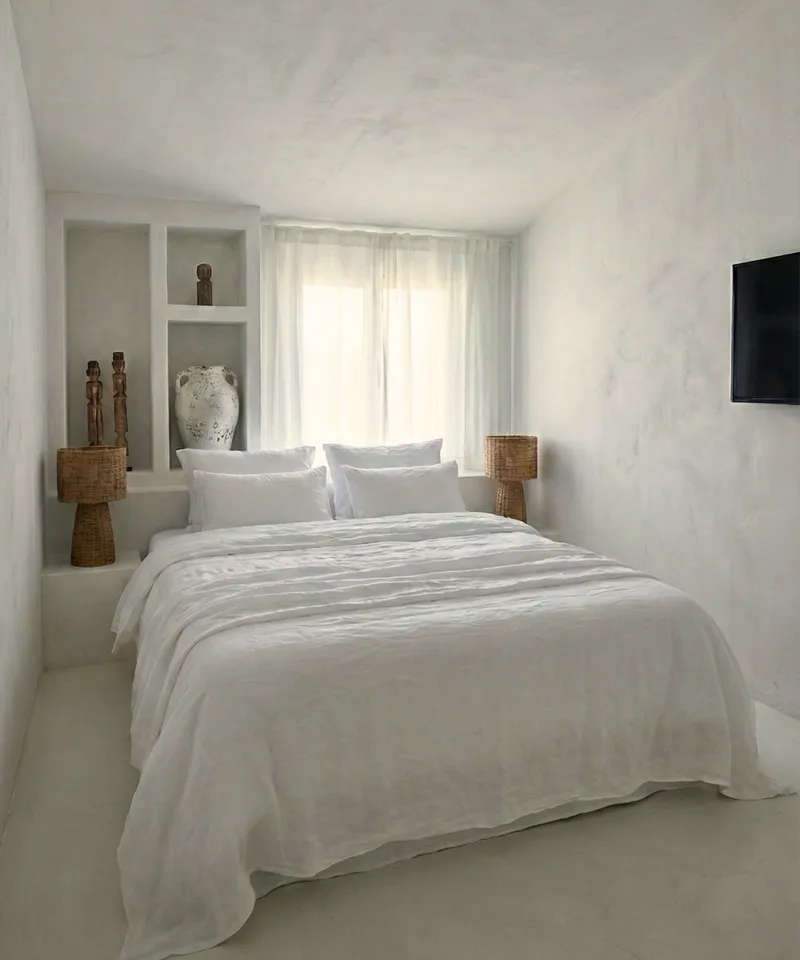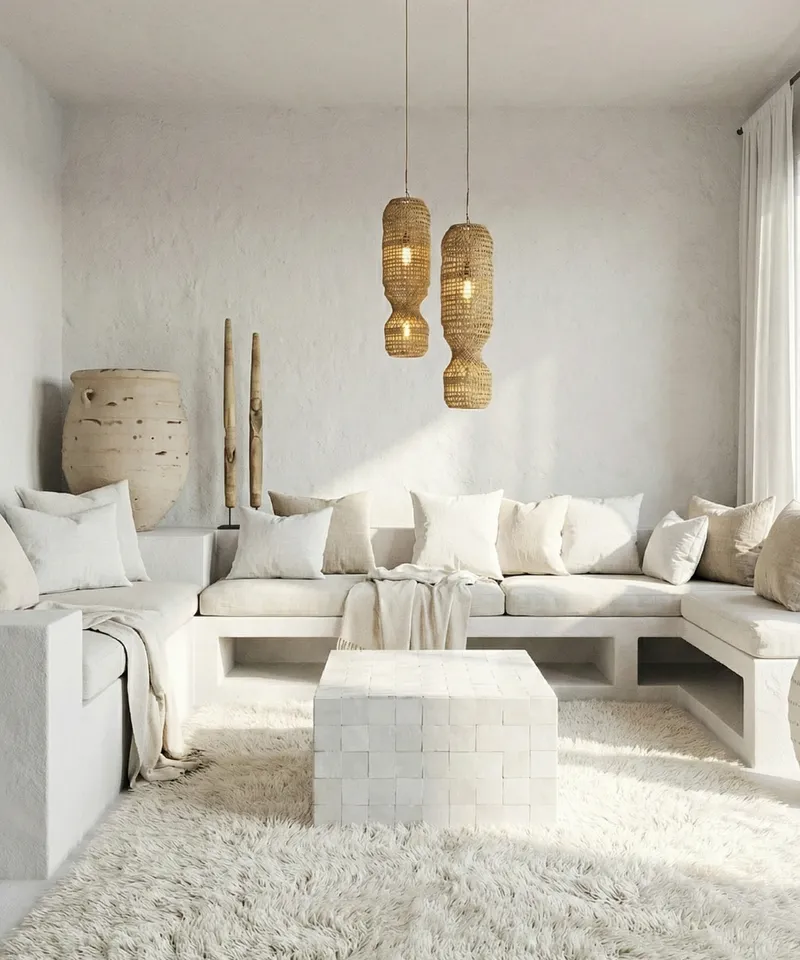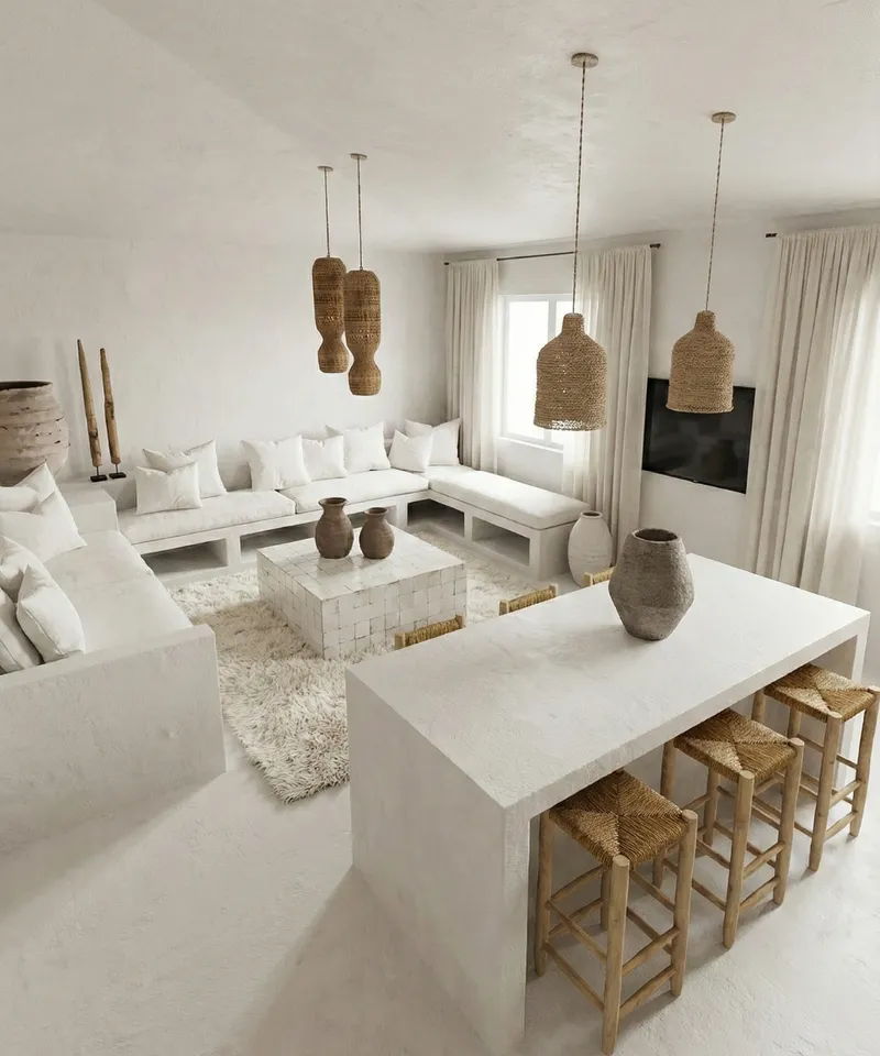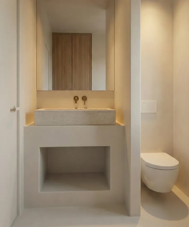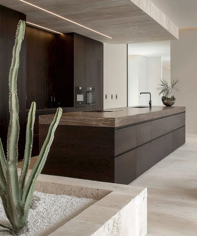 Ici, le minimalisme se réchauffe au contact de la matière et du temps. Les murs enduits, les sols en béton minéral et les volumes massifs dessinent une architecture minérale, brute et apaisée, où la lumière révèle des nuances de sable, de brun et de terre.