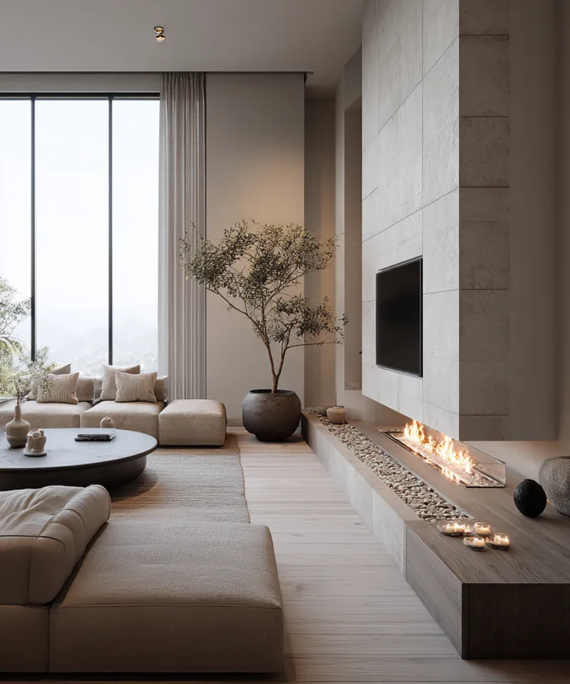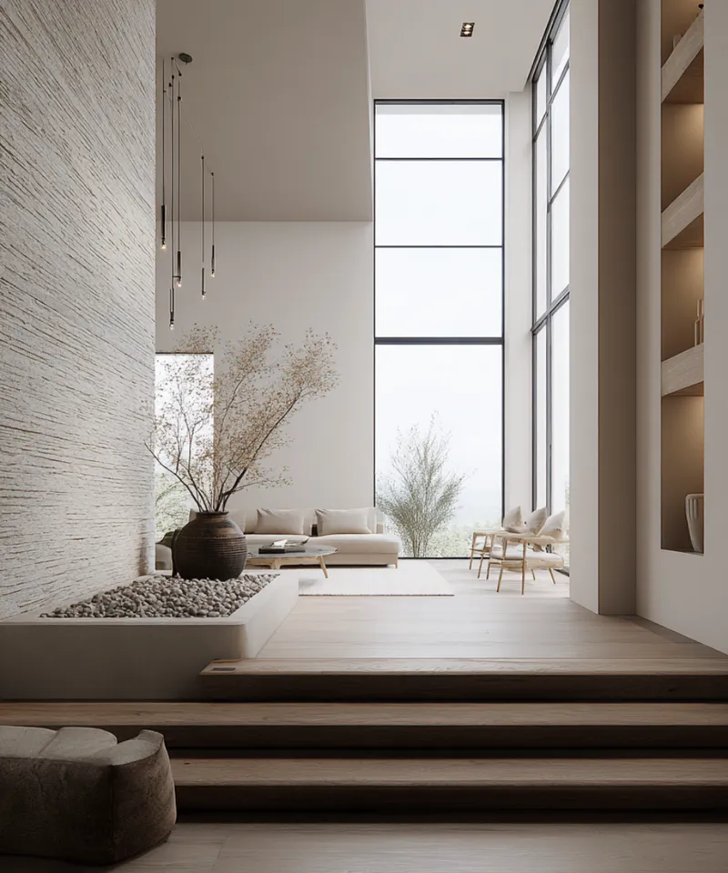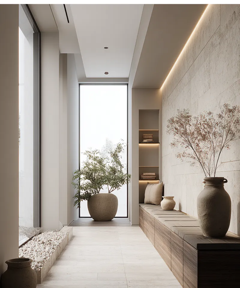 Cette ambiance s’articule autour d’une palette claire et lumineuse, faite de blancs, d’écru et de nuances douces, pensée comme un fond intemporel. La pierre, lisse et l’enduit strié délicatement texturée, rythme l’espace avec discrétion, tandis que le bois foncé, utilisé par touches, apporte profondeur et élégance. L’architecture intérieure devient décor : niches, encadrements et variations de volumes sculptent l’espace et jouent avec la lumière. Les jardinières intégrées prolongent le regard vers l’extérieur et invitent la nature à entrer subtilement dans l’intérieur. Un projet sobre et sophistiqué, où matière, volume et lumière dialoguent dans une harmonie douce et contemporaine.